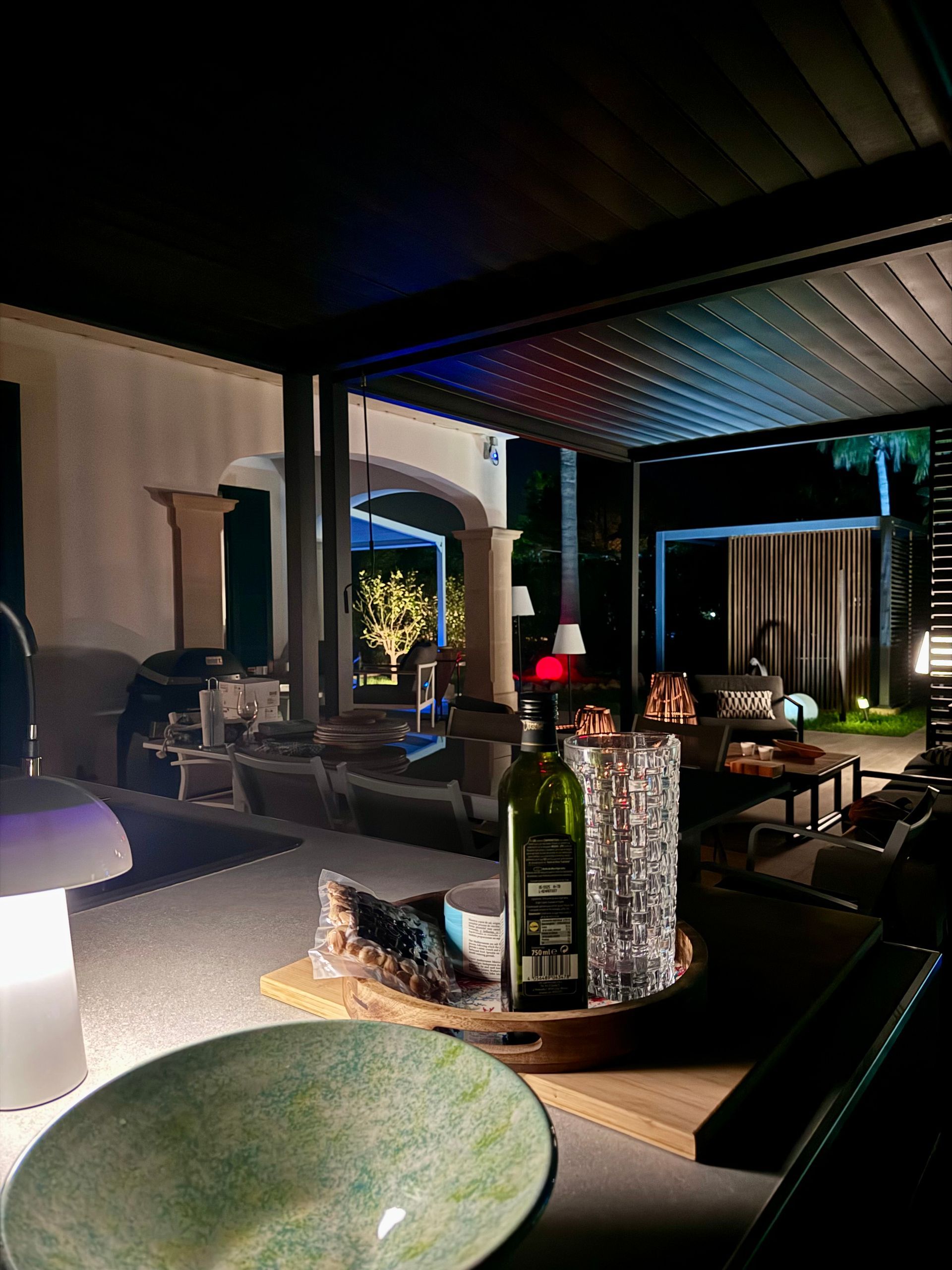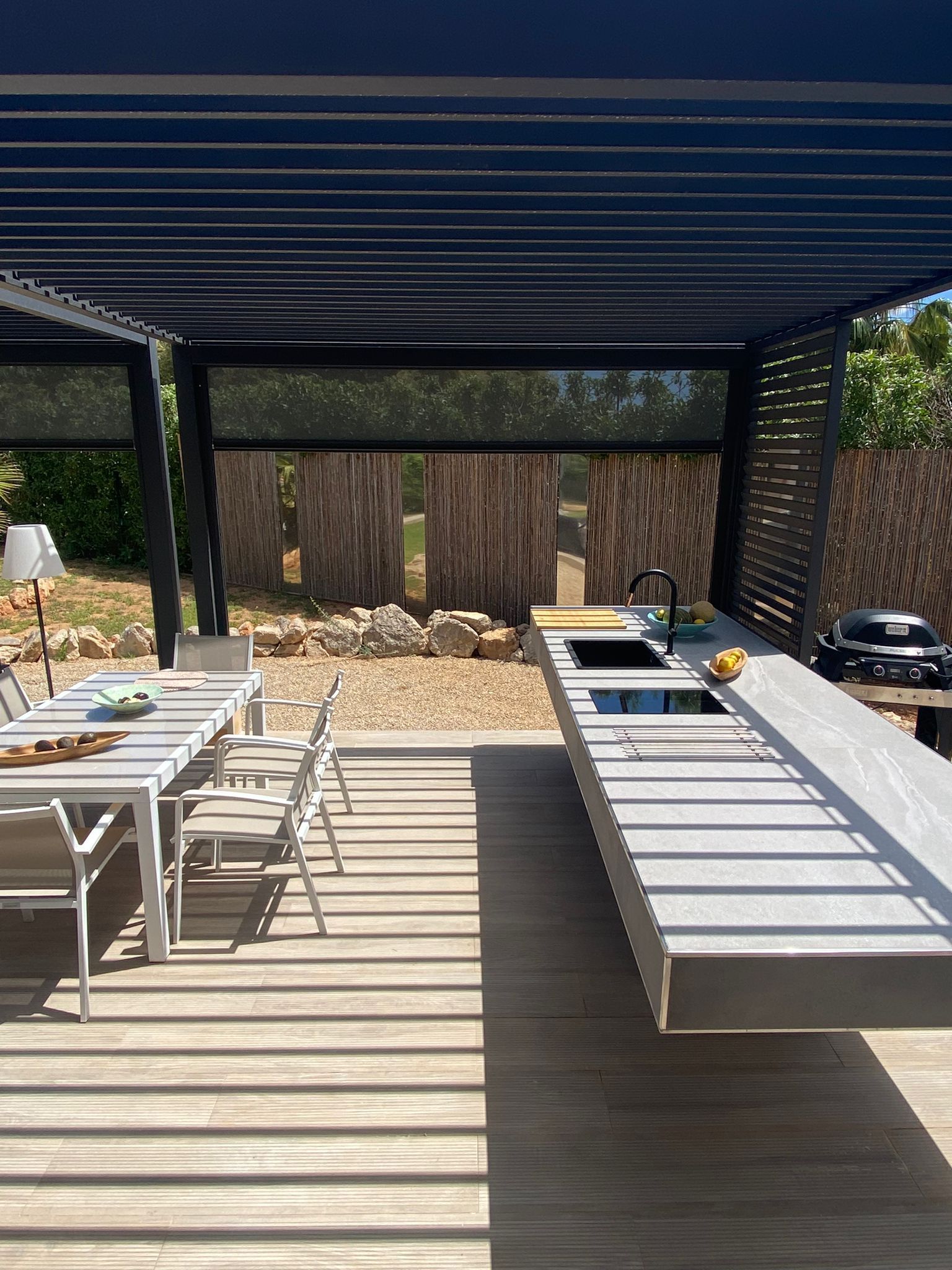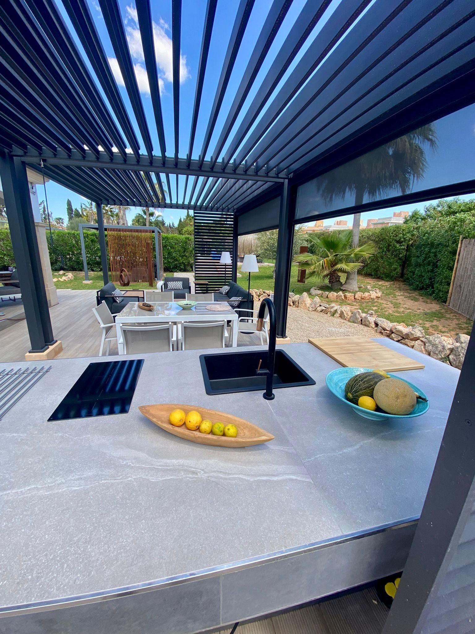 - großzügiger überdachter Terrassenbereich mit mehreren Loungebereichen und einer modernen Außenküche
